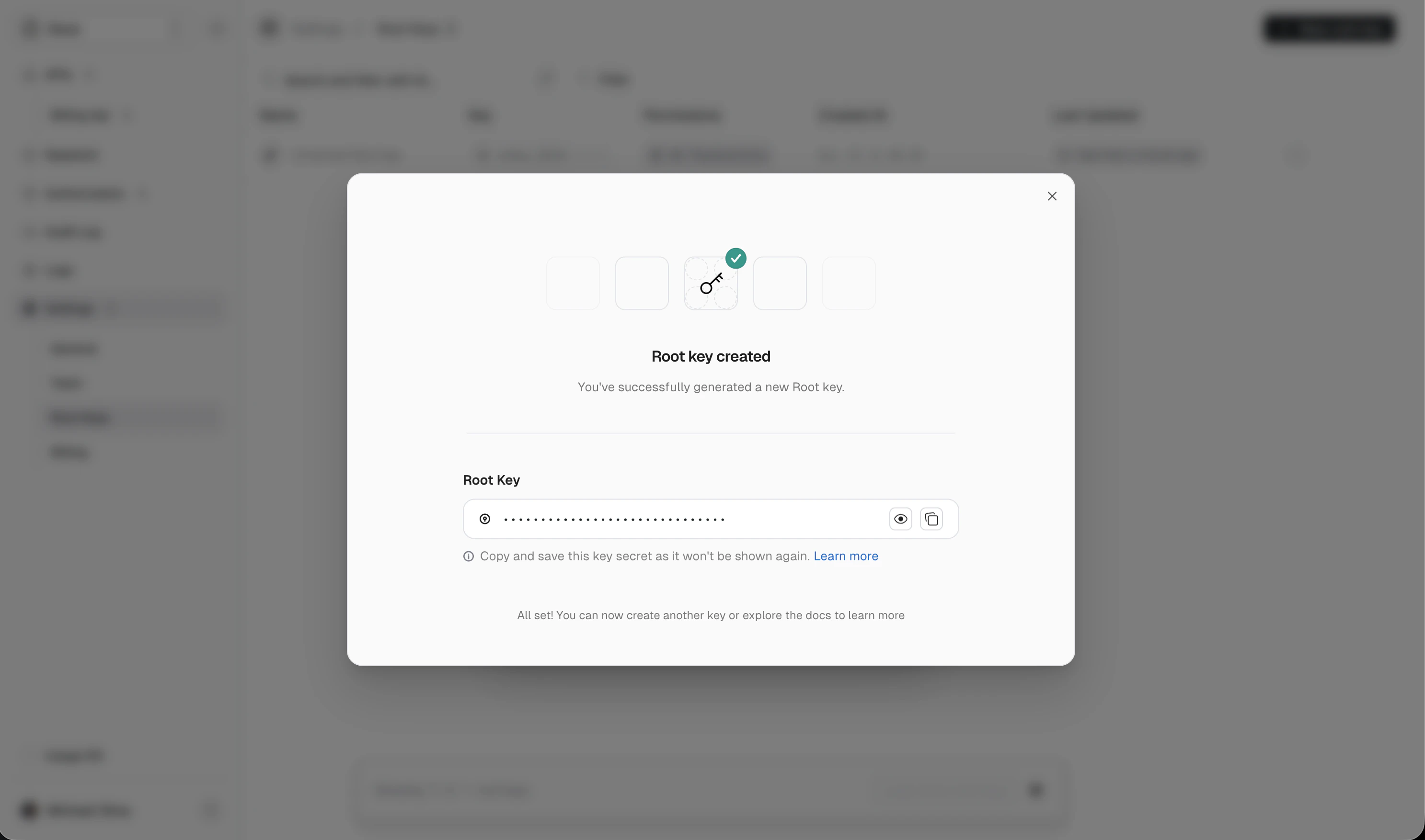 Copy the key immediately — you won’t see it again. Unkey only stores a hash.