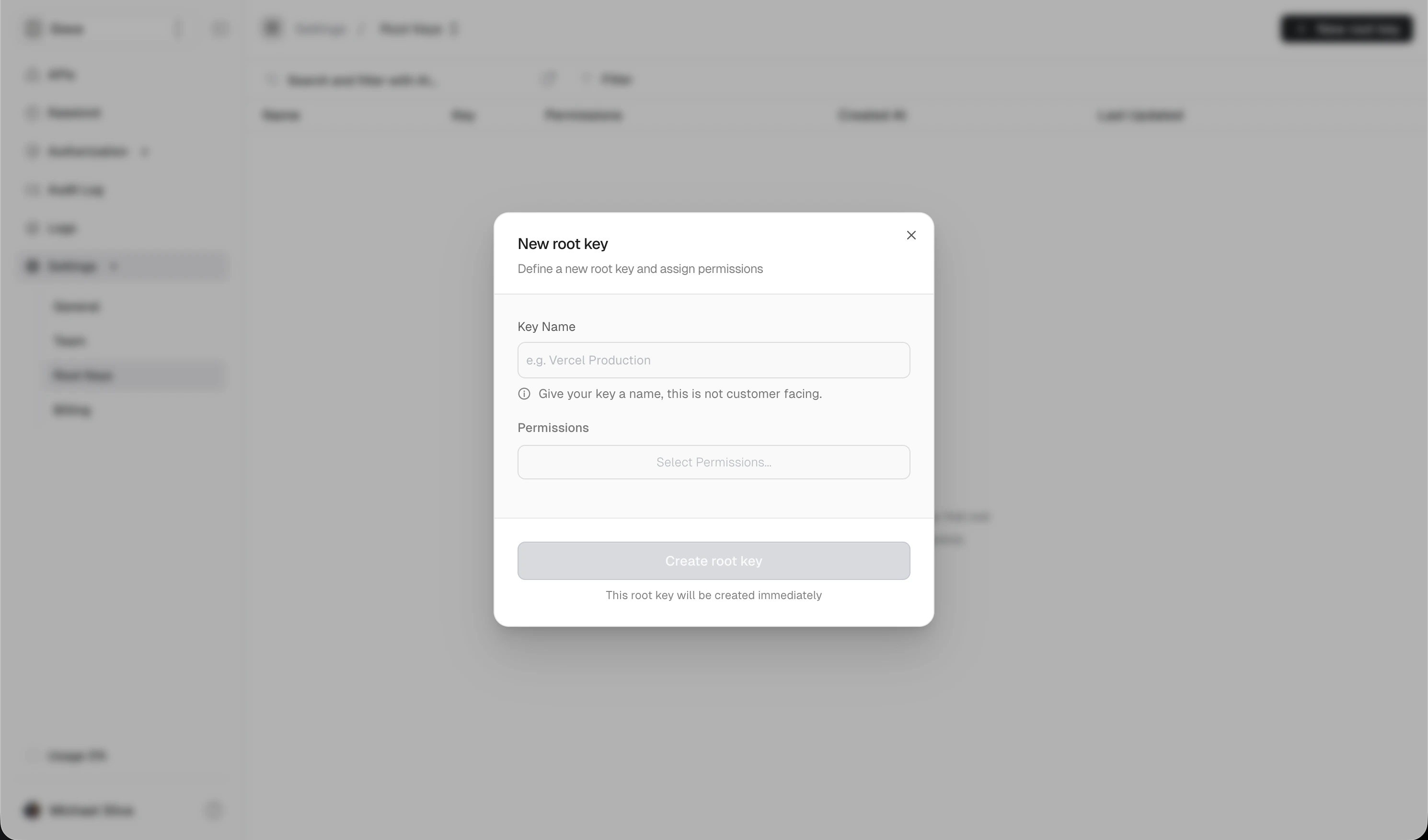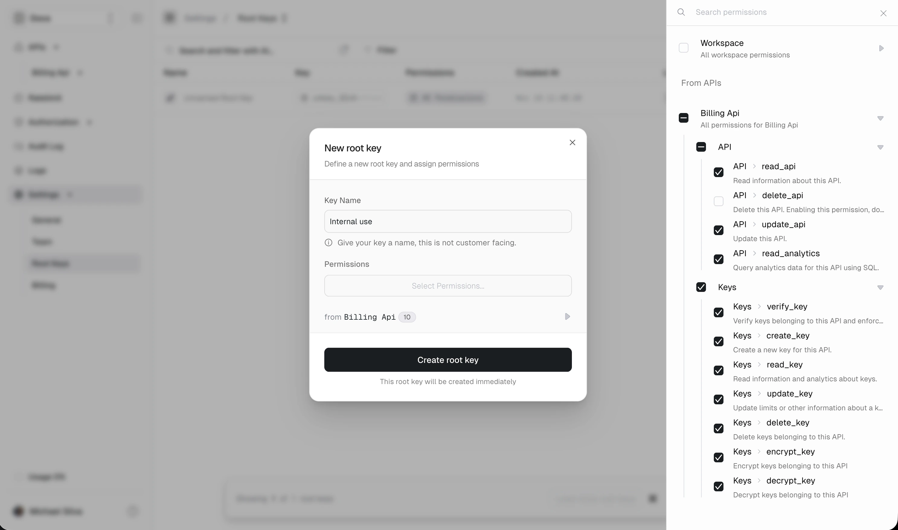 Only grant the permissions each root key actually needs. A key that only verifies API keys doesn’t need delete_key permission.